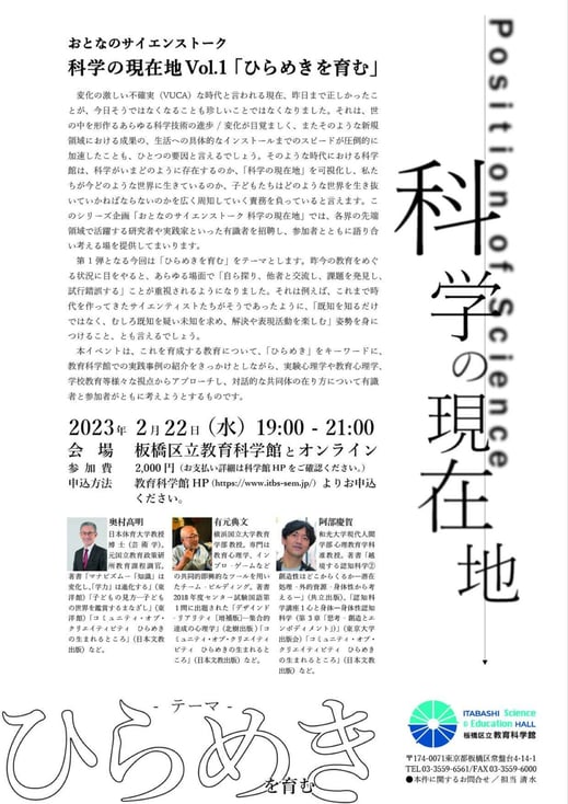 当館ではそんな様々な「ひらめき」をどのようにすると育むことができるのか、いくつかの具体的な教育介入の事例を多角的に検証しながら考える、ゲストの先生方をお呼びしたトークイベントを開催予定です。