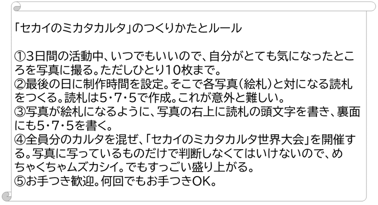 今回は、活動の3日間を通して気になったところをインスタントカメラで写真に撮ってきて、それをそのままカルタ化しました。