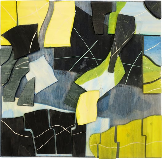 次の週、Mさんは木工塗料を水で薄め、淡い青や黒を混ぜながら刷毛で基底材に塗っていきます。木工塗料は水で調整して塗ると、木目が浮かび上がるように見えてきます。前時に切った板材には濃い木工塗料で黄色、少し黒を混ぜた黄色、黒、青などを塗っていきました。気持ちよさそうに色を塗っているMさんは、この時、「海」にしようと考えたようです。その後も、基底材の上で何度も板をずらし、置き変え、でこぼこの形のよさや美しさを感じ取りながら、どう組み合わせようか考えていました。