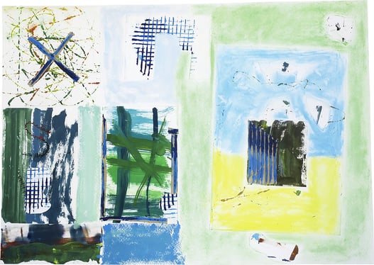 Sさんは、まず、ビー玉や段ボールでできるもようを楽しみました。その後、太い刷毛でSさんが大すきな緑や青を混ぜて色をつくり、ぐいっと線をかき、かすれたり、にじんだりすることをためしていきます。刷毛でかいた上に、さらに色味の違う緑や青をつくってかき加えています。ビー玉などを使っている時より、ぐっと深く何かを探しているように、私はSさんの姿から感じました。