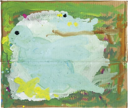 私は図工室を一回りしてNさんのところに戻ってくると、ボタン色の画面は緑色に変わっていました。Nさんは色を重ねて色が変化すること楽しむかのように、次は白をたっぷりとお皿に盛り、緑の上から重ねました。粘りのある絵の具は、にじむことなく色合いを残しながら画面の上で重なっていきます。