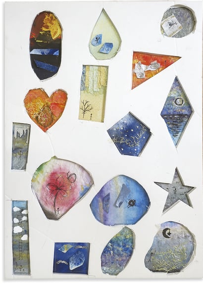次の週は、スチレンボードのまどの形をカッターナイフでくり抜き、自分の絵を裏からおさめていきます。Kさんはまどの中に入った絵を見て、自分の思いがはっきりとしてくるように感じたのでしょうか。さらに切り落とした絵のかけらを他のまどにコラージュすることを楽しんでいます。そして、最後に0.7mmの細い黒のペンで、水彩絵の具の色や形を手がかりにして、形を強調させたり、木々をかいたり、人間のような形をかき加えていきました。