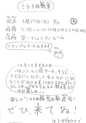 テーマに照らして「授業」の内容もブラッシュアップ。1年生の部員が頑張る「ほうき犬」には「ネコのぞうきん」も仲間入り。6年生と4年生の2人で取り組む「りょうり友だち」は「きゅうしょくロボット」に名称を変更したようだ。5年生の部員は新たに「実力はんていロボット」の製作に着手。それぞれの「ミライ」のイメージが続々と具現化していく。